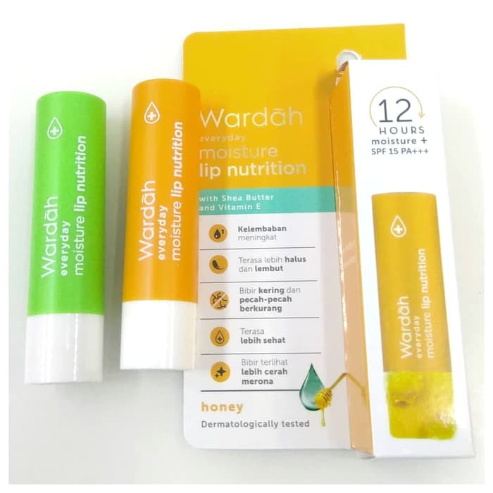 Wardah everyday moisture lip nutrition with the shea butter dan vitamin e adalah lipbalm yang memberikan kelembapan ekstra . Lip balm produksi brand lokal, wardah ini memiliki kandungan shea butter yang memiliki fungsi untuk menjaga kelembaban bibir selama 12 jam, . Wardah everyday moisture lip nutrition spf 15 honey ingredients explained: Kandungan shea butter dan vitamin e dapat menjaga kelembaban bibir selama 12 jam. Selain mengandung banyak manfaat untuk menyehatkan bibir, dua produk terbaru wardah ini pun sudah di bekali label halal dan bpom.